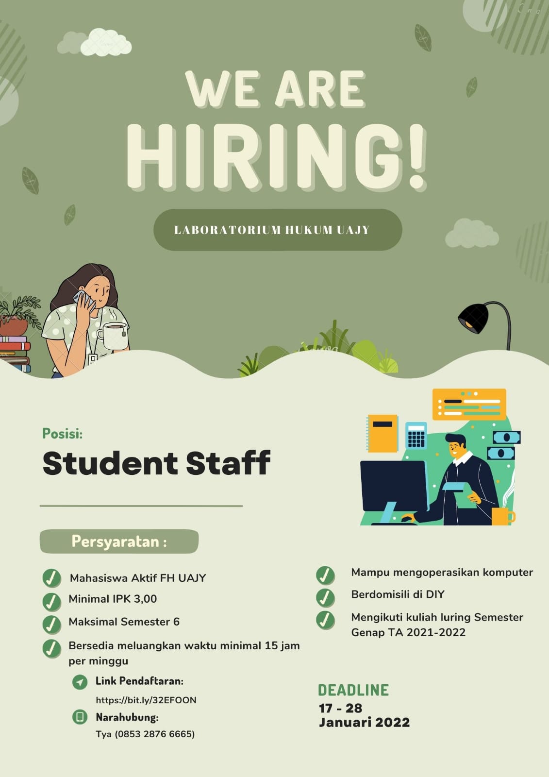 Bergabung bersama Student Staff Laboratorium Hukum, daftarkan dirimu segera. Persyaratan : IPK minimal 3,00 Minimal Semester 3 Bisa mengoperasikan komputer…